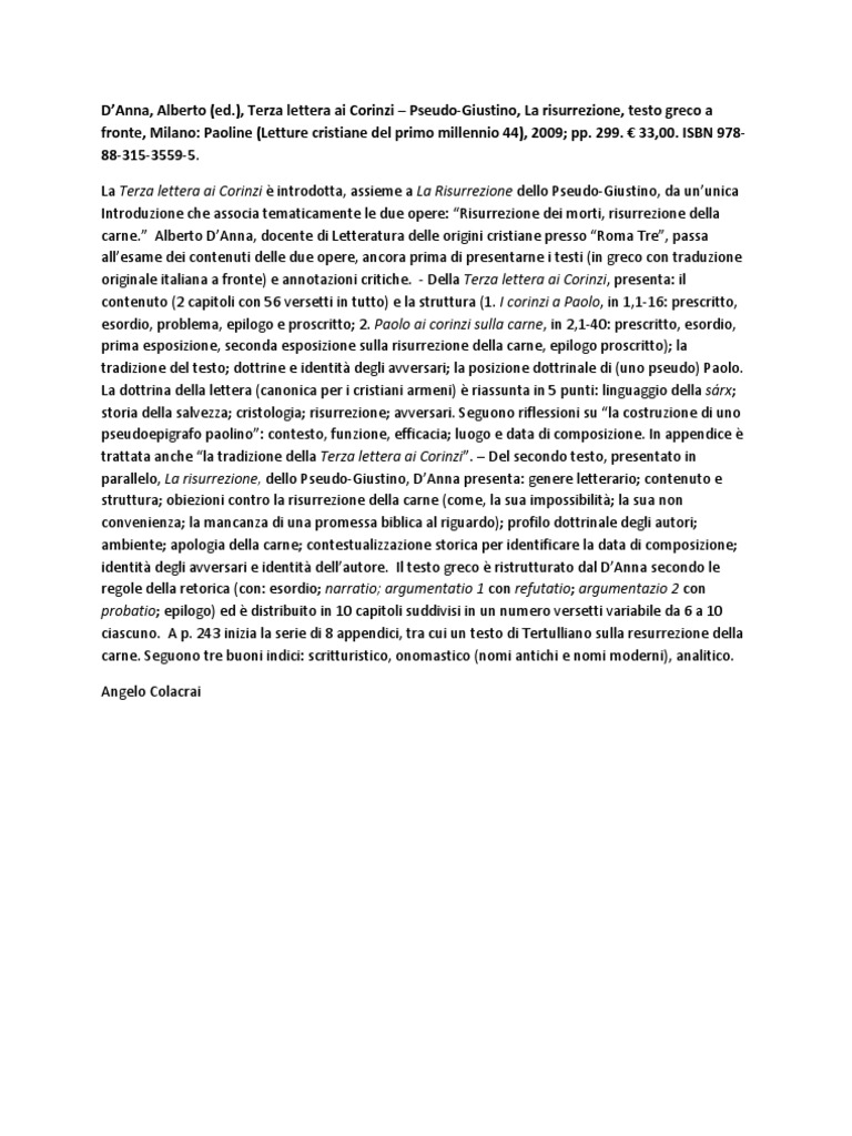 Lettere di Paolo - Wikipedia Terza lettera di Paolo ai Corinzi; Lettera ai Laodicesi; Carteggio apocrifo di Seneca e Paolo. La Terza lettera ai Corinzi fu considerata canonica per qualche tempo dalla Chiesa apostolica armena. La lettera ai Laodicesi è considerata senz'altro non canonica. Dibattito sull'autore Lettera di San Paolo ai Corinzi, la Bibbia | Aforismi - Libreriamo Lettera di San Paolo ai Corinzi, la Bibbia | Aforismi, 'L'amore è sempre paziente e gentile, non è mai geloso. L'amore non è mai presuntuoso o pieno di sé, non è mai scortese o egoista, non si offende e non porta rancore. L'inno sull'amore - San Paolo - Lettera ai Corinzi Il famoso Inno all'amore tratto dalla Prima lettera ai Corinzi 13.1-13, una poesia, una lezione di vita se tutti riuscissimo a mettere in atto quanto scrive San Paolo, saremmo dei Santi! Se anche parlassi le lingue degli uomini e degli angeli, ma non avessi l'amore, sono come un bronzo che risuona, o un cembalo che tintinna. PDF I Lettera ai Corinzi - Diocesi di San Miniato Una lettera ricca di spunti per la vita cristiana personale e comunitaria. I problemi di una Chiesa nascente sono affrontati alla luce della fede e San Paolo si mostra davvero un grande testimone, capace di guidare efficacemente non solo i Corinzi, ma anche noi, sulle vie del Signore e di una ricca vita di comunione.