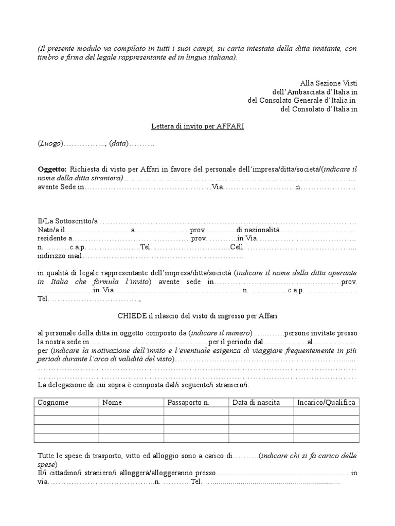 Lettera Invito per Ospiti Stranieri: Esempio da Compilare e Tradurre ... Lettera Invito per Ospiti StranieriEsempio da Compilare e Tradurre nella Lingua Dell'Ospite E' obbligatorio (solo per alcuni paesi) qualora ospitaste cittadini Stranieri in Italia(Brasiliani, Cubani etc, etc), inviare in originale una lettera di invito , con la specifica della permanenza in Italia.